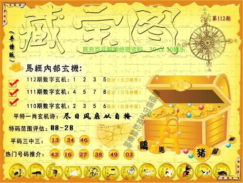 111期平特藏宝图玄机 【幽岛曲池相隐映】 解:意思是曲池解出水肖鼠猪 特码范围评估:24-38 推荐六肖:鼠虎狗鸡牛猪